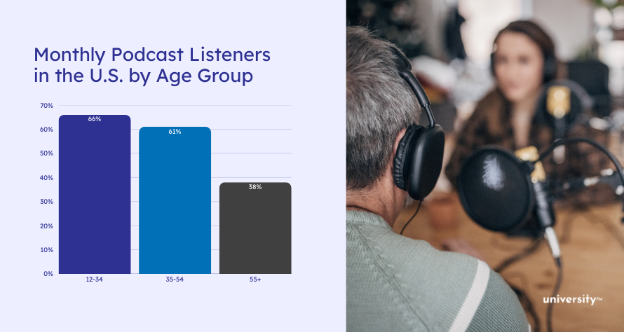 Podcast listenership isn’t slowing down. Globally, there were 584 million podcast listeners in 2025, and that number is projected to grow to 619 million in 2026. In the U.S. alone, 55% of people aged 12 and up listen to podcasts monthly. That’s roughly 158 million potential listeners.
